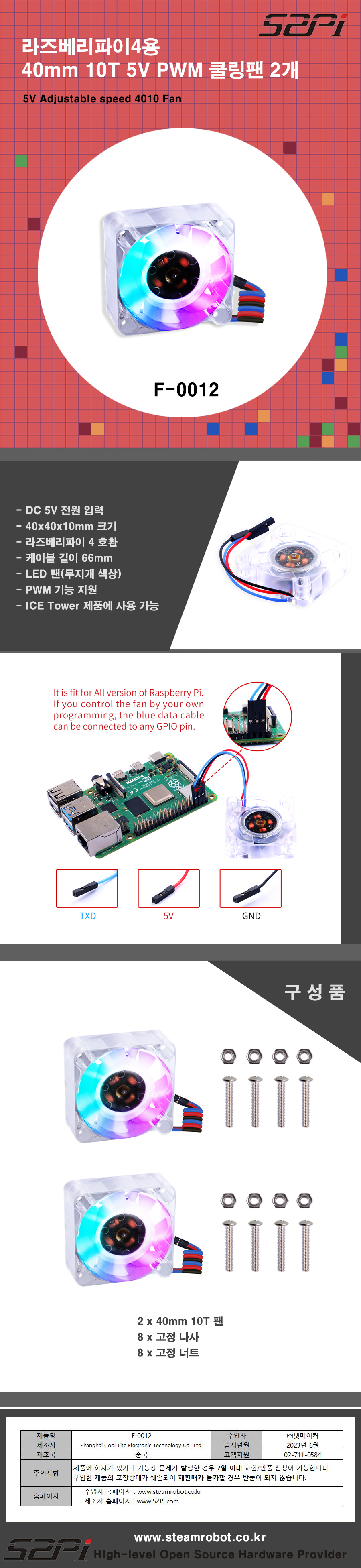 52Pi - 오이파이 라즈베리파이4용 40mm 10T 5V PWM 쿨링팬 2개 [F-0012]