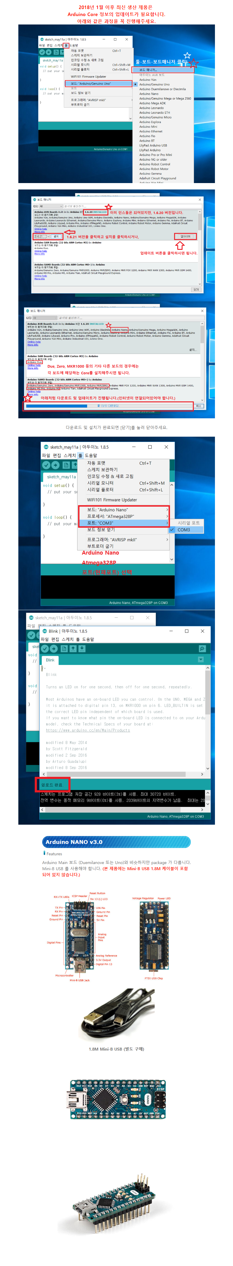 A000005,아두이노 나노 - 작고, 완벽한, 브레드보드 친화적인 ATmega328 기반의 보드 / Arduino Due와 기능적으로 유사하나, DC 파워잭이 빠지고 Mini-B USB 케이블을 통해서만 전원 공급이 가능