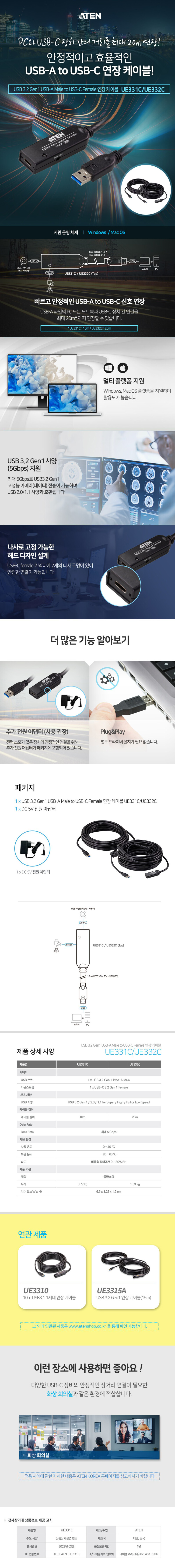 20m USB 3.2 Gen1 USB-A Male to USB-C Female 연장 케이블